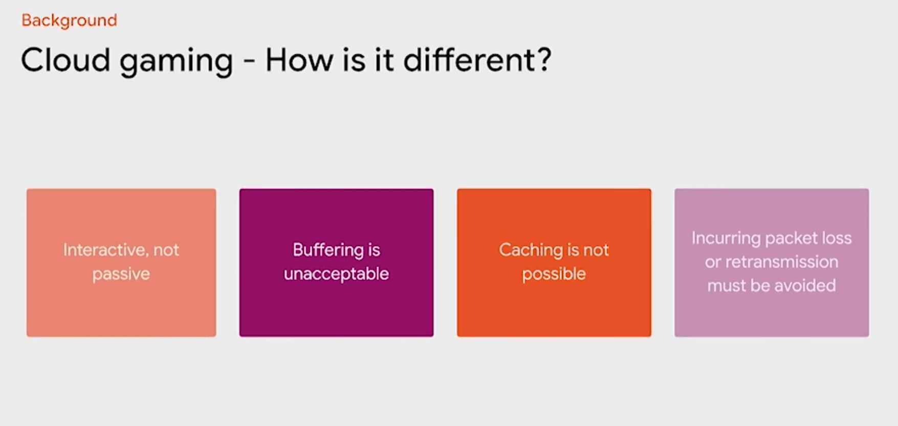 - 云游戏体验优化:要实现云游戏游玩接近本地游玩体验,需要专门的优化;下面讲到的谷歌云游戏Stadia技术实现,重点就是用户体验优化。