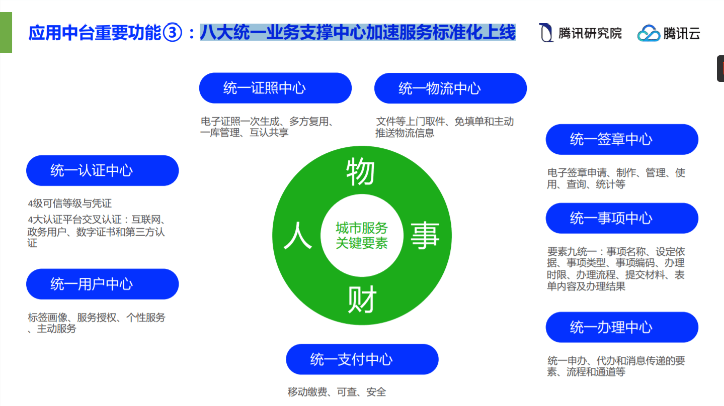 在 腾讯研究研究-WeCity未来城市-智慧城市进化之道 中,给出了智慧城市应用中台重要功能:八大统一业务支撑中心加速服务标准化上线。可参考作为智慧城市基础业务功能全景图。