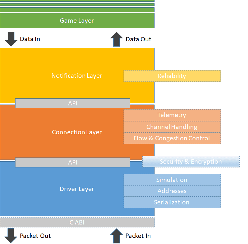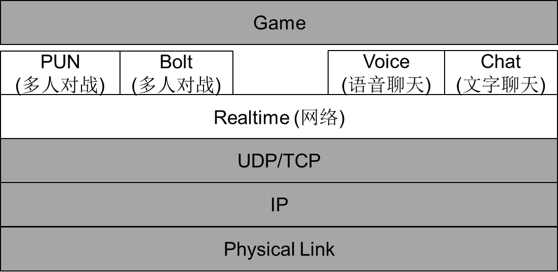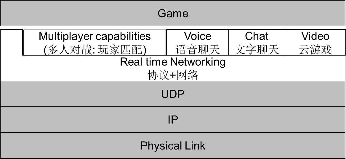 下图是游戏网络引擎技术栈,多人在线游戏通信模式为低时延小包,因此传输层协议一般使用UDP。在UDP之上提供可靠传输等特性,称为实时网络。在此基础上,实现多人对战玩家匹配、语音聊天、文字聊天、视频功能。