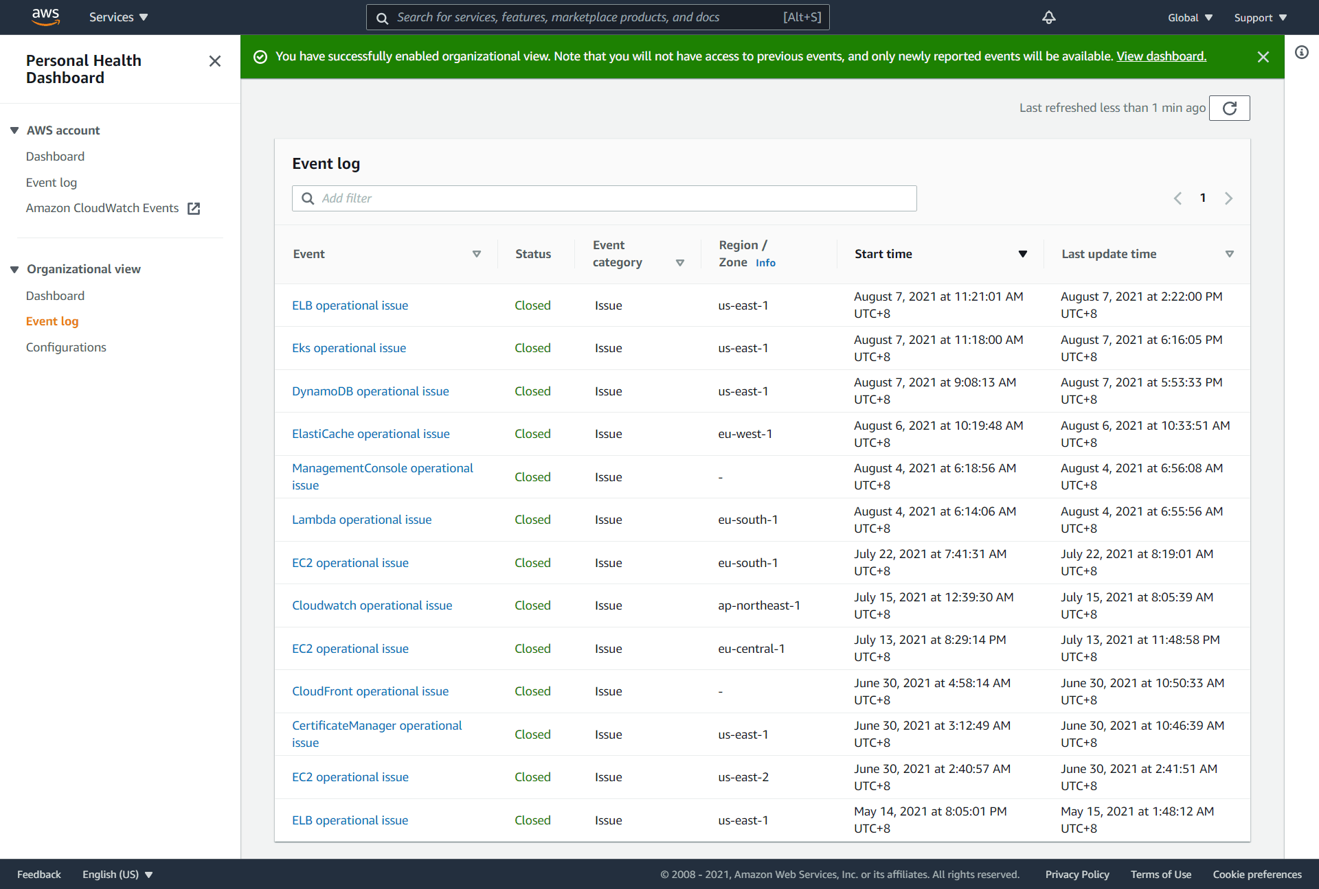 AWS Health 提供租户资源健康看板,包括租户的资源健康状态、以及AWS服务健康状态。AWS Health 与 AWS Organization集成,管理员账号可以在PHD(Personal Health Dashboard)上查看到组织内所有账号下的资源监控状态、以及事件通知。