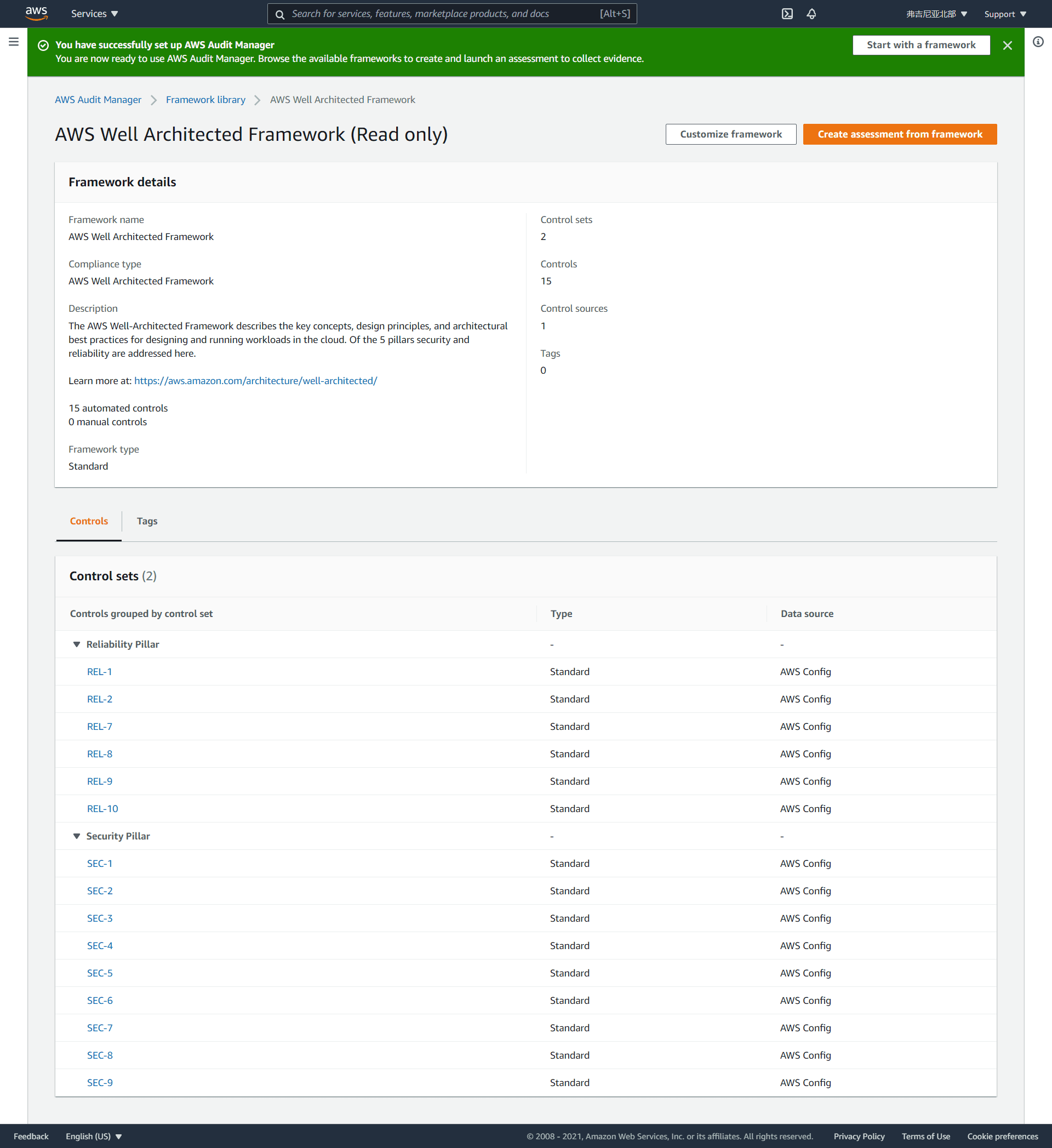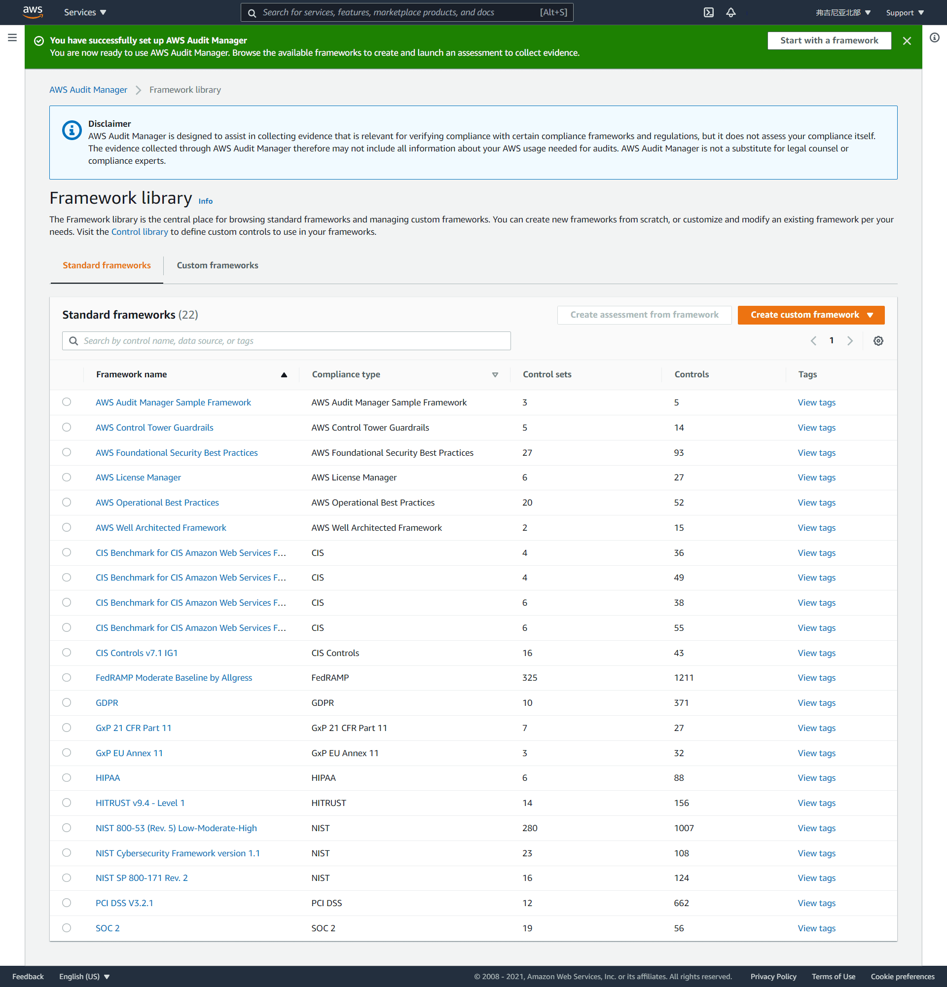 支持的框架列表: https://docs.aws.amazon.com/audit-manager/latest/userguide/framework-overviews.html ,总共22个。