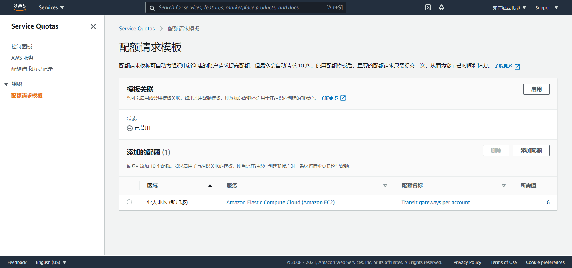 AWS Service Quota 与 AWS Organization集成,组织管理员账号可以配置“配额请求模板”(最多10个),当新的组织成员账号加入时候,会自动触发执行“配额请求模板”,为账号设置配额。 注意,新创建账号时候并不能设置默认的账号配额。